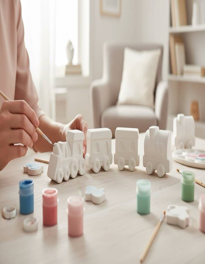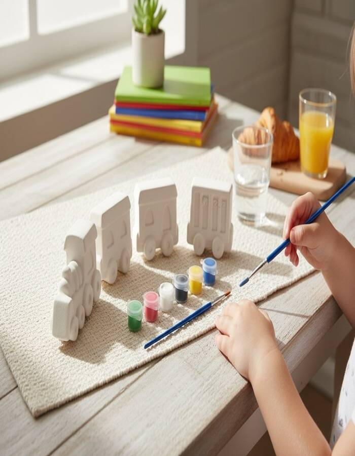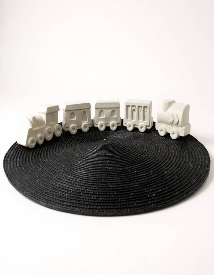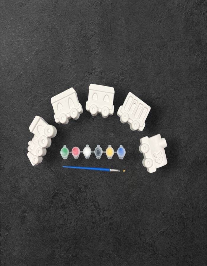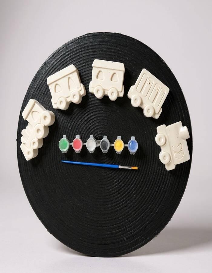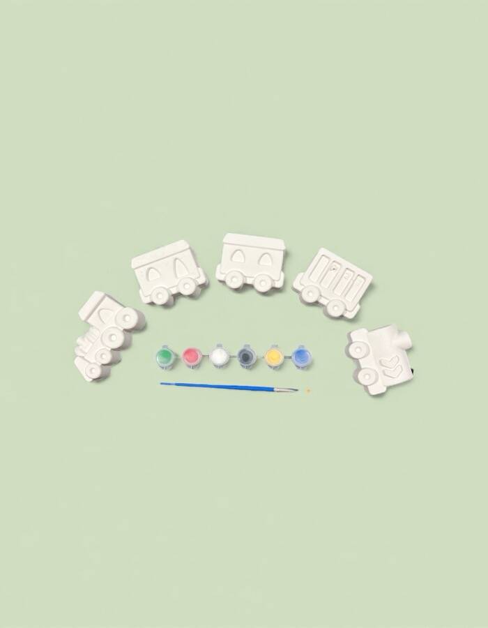 Tren ve vagon temalı figürler taş tozundan üretilmiştir. Pürüzsüz yüzeyleri sayesinde kolayca boyanabilir. Set içerisinde bulunan boyalar ve fırça ile ürün hemen kullanıma hazır olarak gönderilir. Boyama sonrası figürler oyuncak, dekoratif obje veya hediye olarak değerlendirilebilir.
