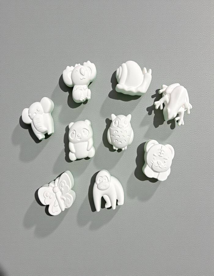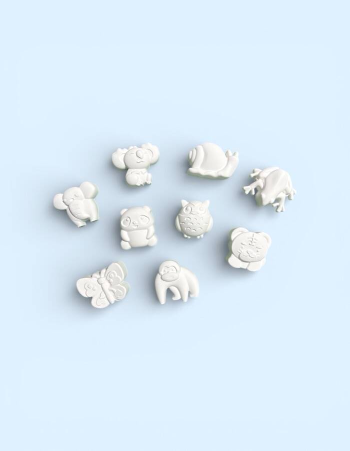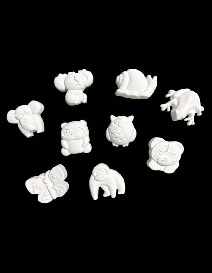 🧱 Taş tozundan üretilmiş 9 adet sevimli hayvan figürü (fil, panda, baykuş, koala, kurbağa, kelebek vb.)