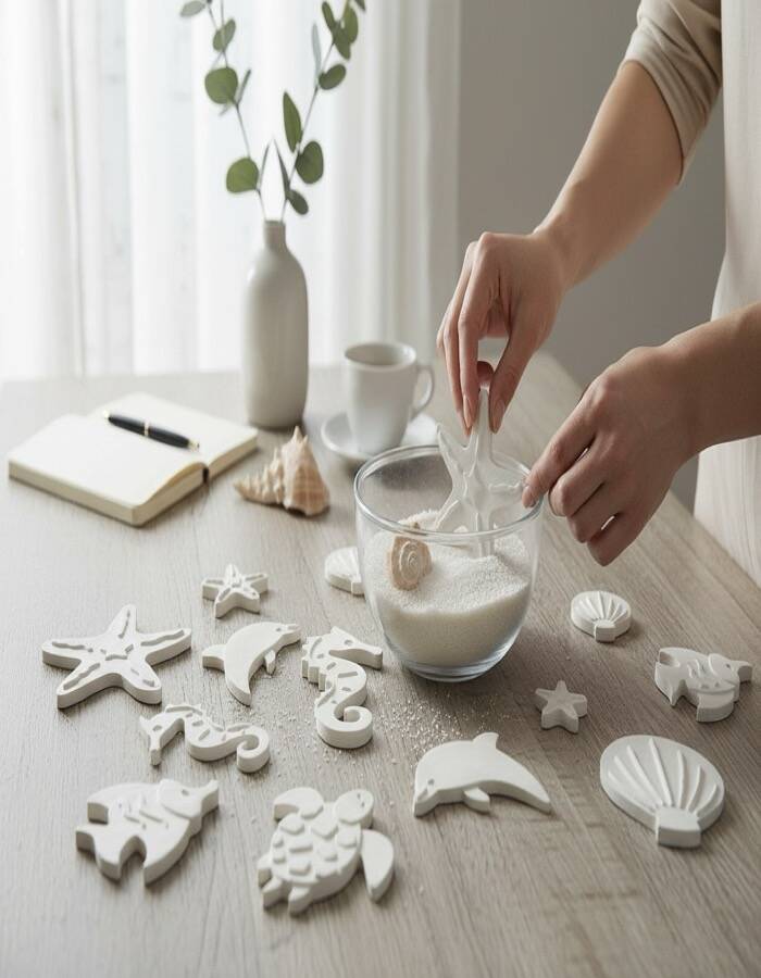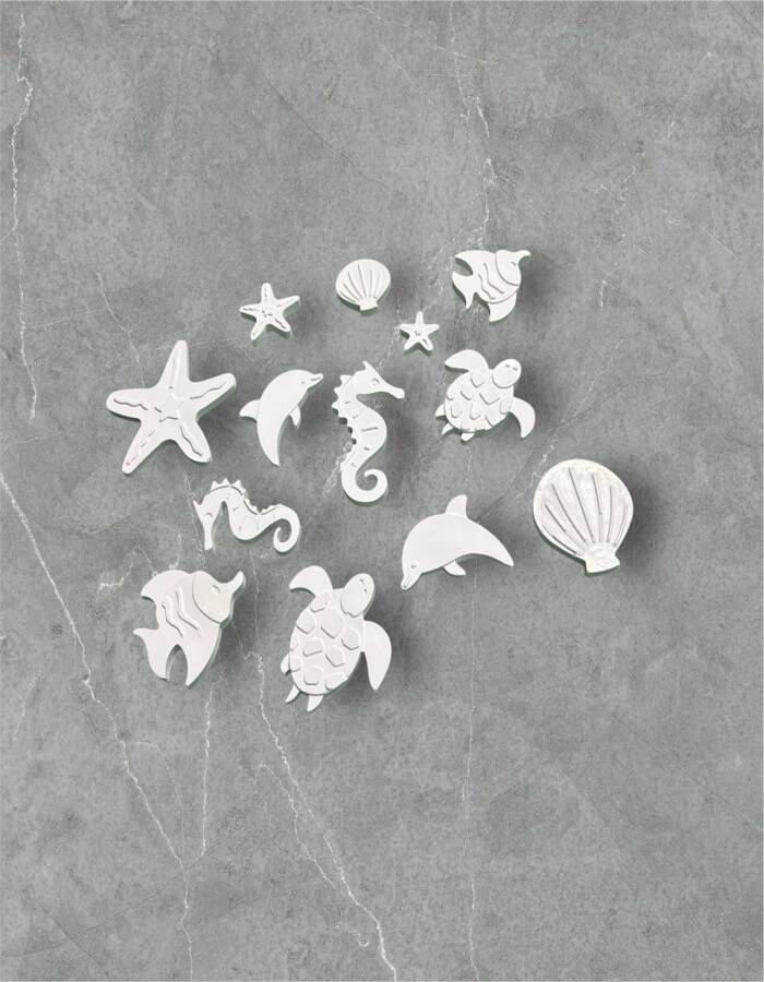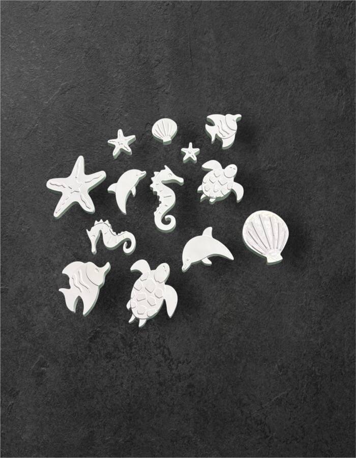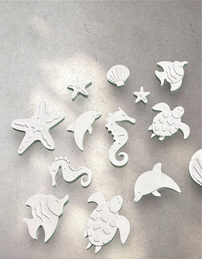 🧱 Taş tozundan üretilmiş deniz canlıları figürleri (13 adet) (deniz yıldızı, balık, yunus, deniz kabuğu, kaplumbağa vb.)